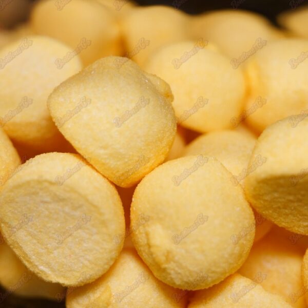 Boules de guimauve moelleuse, fondante et tendre, recouvertes d’une légère couche de sucre.