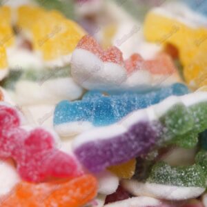 Composition : sucre, sirop de glucose-fructose, eau, gélatine alimentaire, , arôme, colorant E120, amidon de maïs.